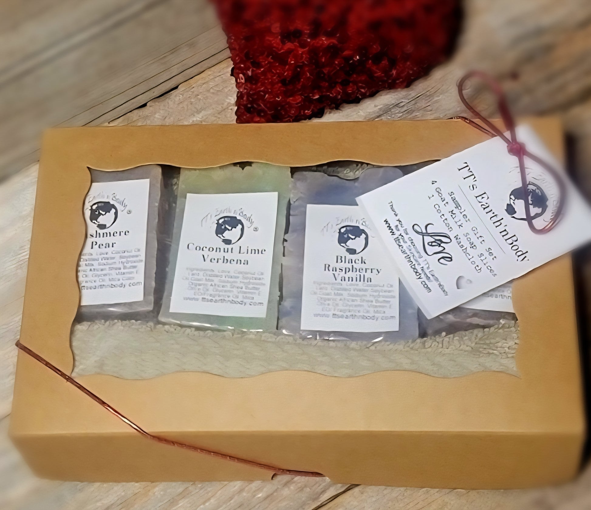This 5pc Valentine's Day Soap Sampler Gift Box comes with 4 goat milk soap slices and a cotton washcloth. Perfect gift for that special someone. Each gift box comes with a "Love" tag description ready to gift.